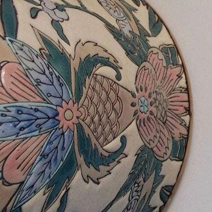 Lovely jade, pink, and light blue on a cream colored field. Gold rims.