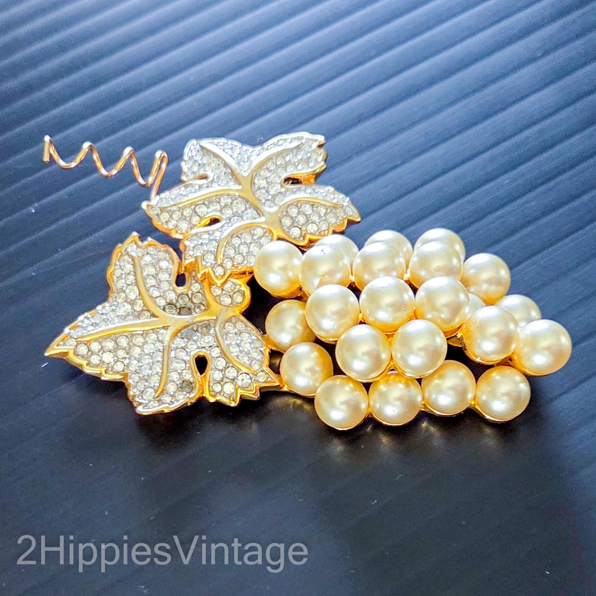 Vintage Swarovski gold-plated grape cluster brooch featuring imitation pearls and pave-set crystal leaves. It is a retired piece from the Swarovski Jeweler's Collection