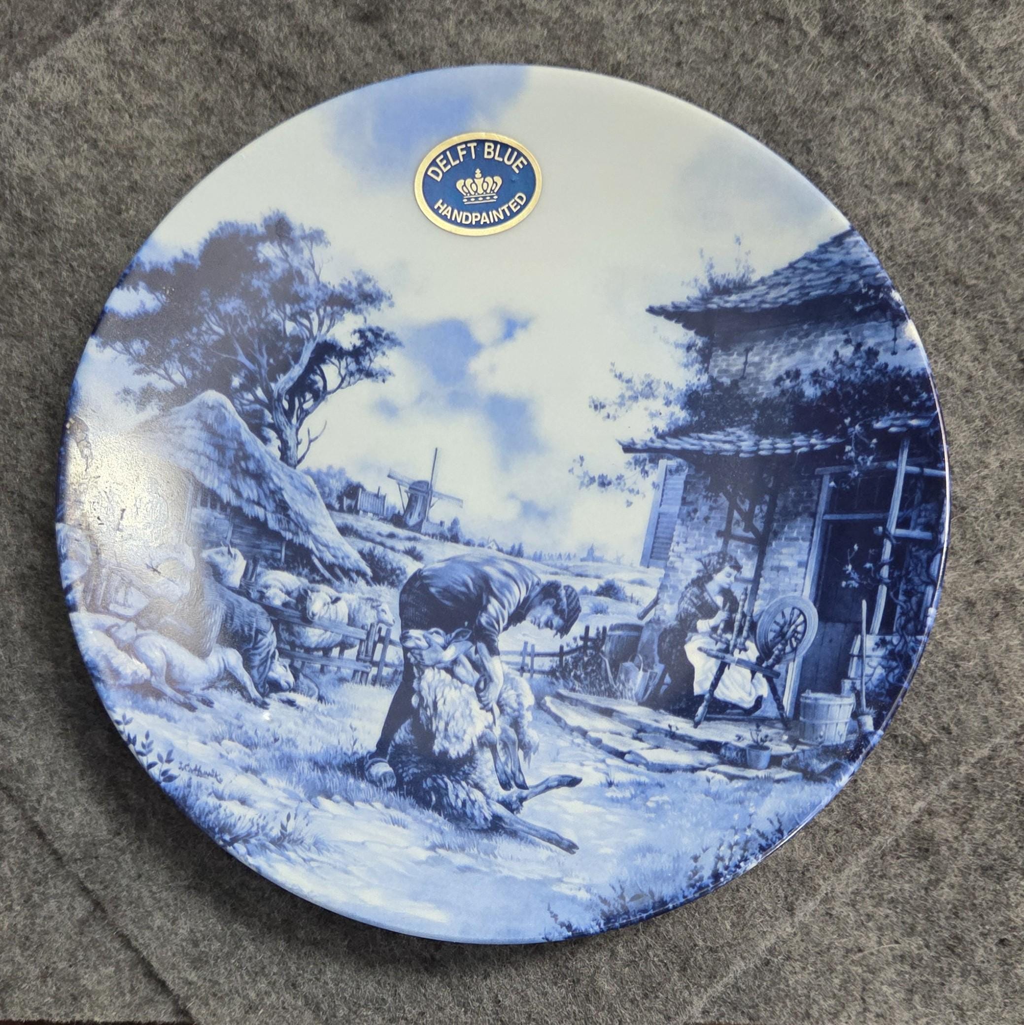 This particular plate, marked as "handpainted," suggests it was crafted with individual artistic attention rather than being purely machine-made, which is a common feature of collectible Delftware. The scene depicted, likely a rural Dutch setting with activities like sheep shearing and spinning, is a popular motif that evokes traditional Dutch heritage and craftsmanship. Such plates were often made as decorative items for display, particularly as wall hangings.