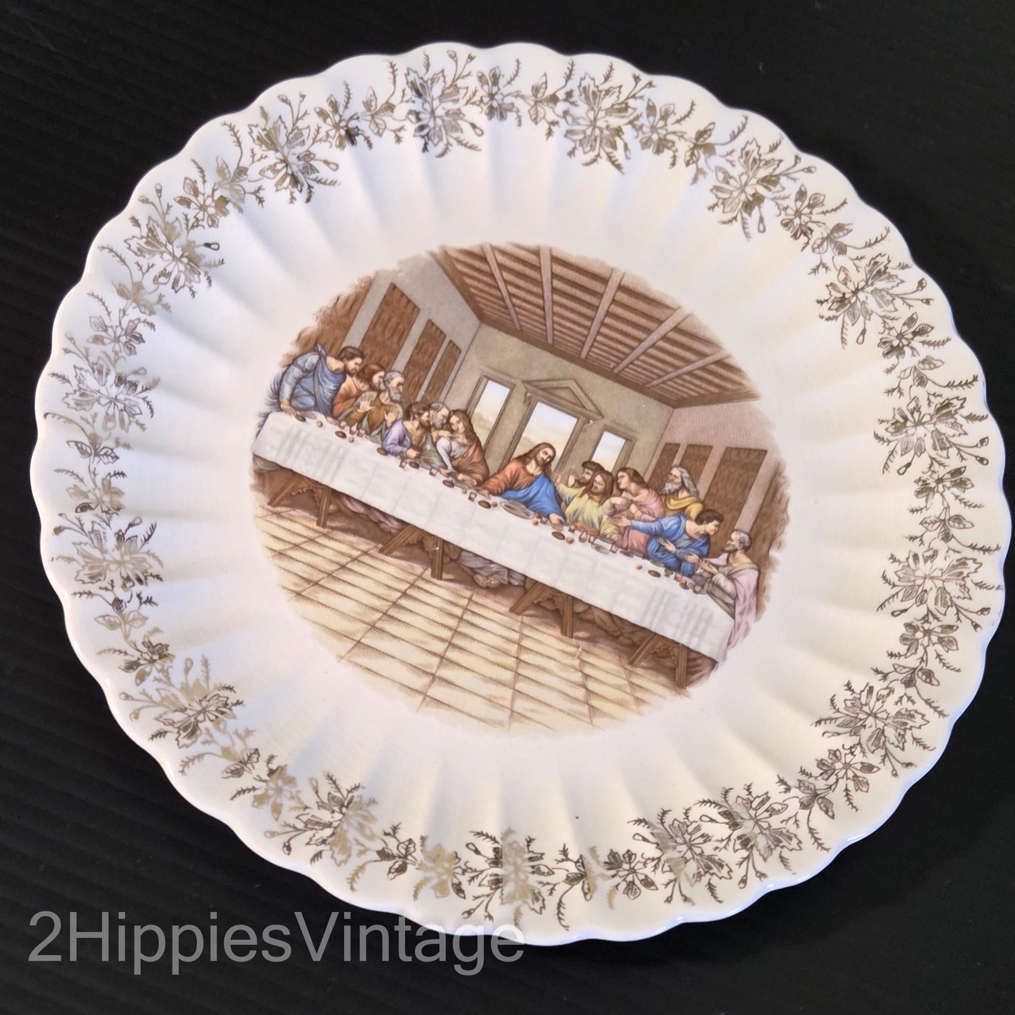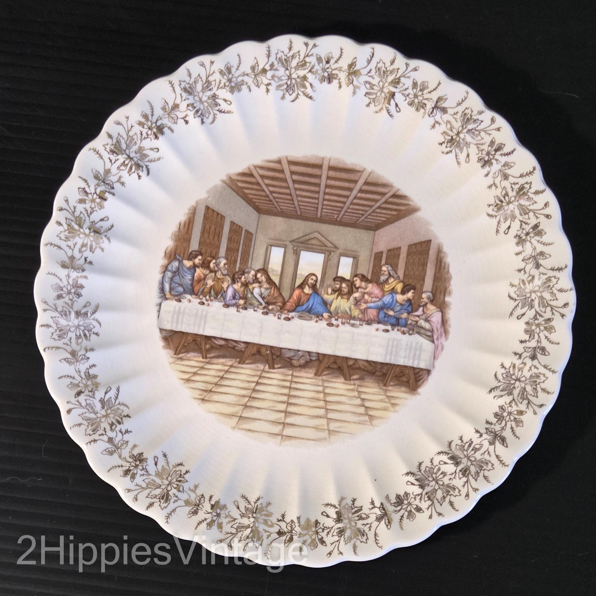 vintage Lord's Supper decorative collector plate, typically featuring a central image of Jesus and his disciples inspired by Leonardo da Vinci's "The Last Supper".