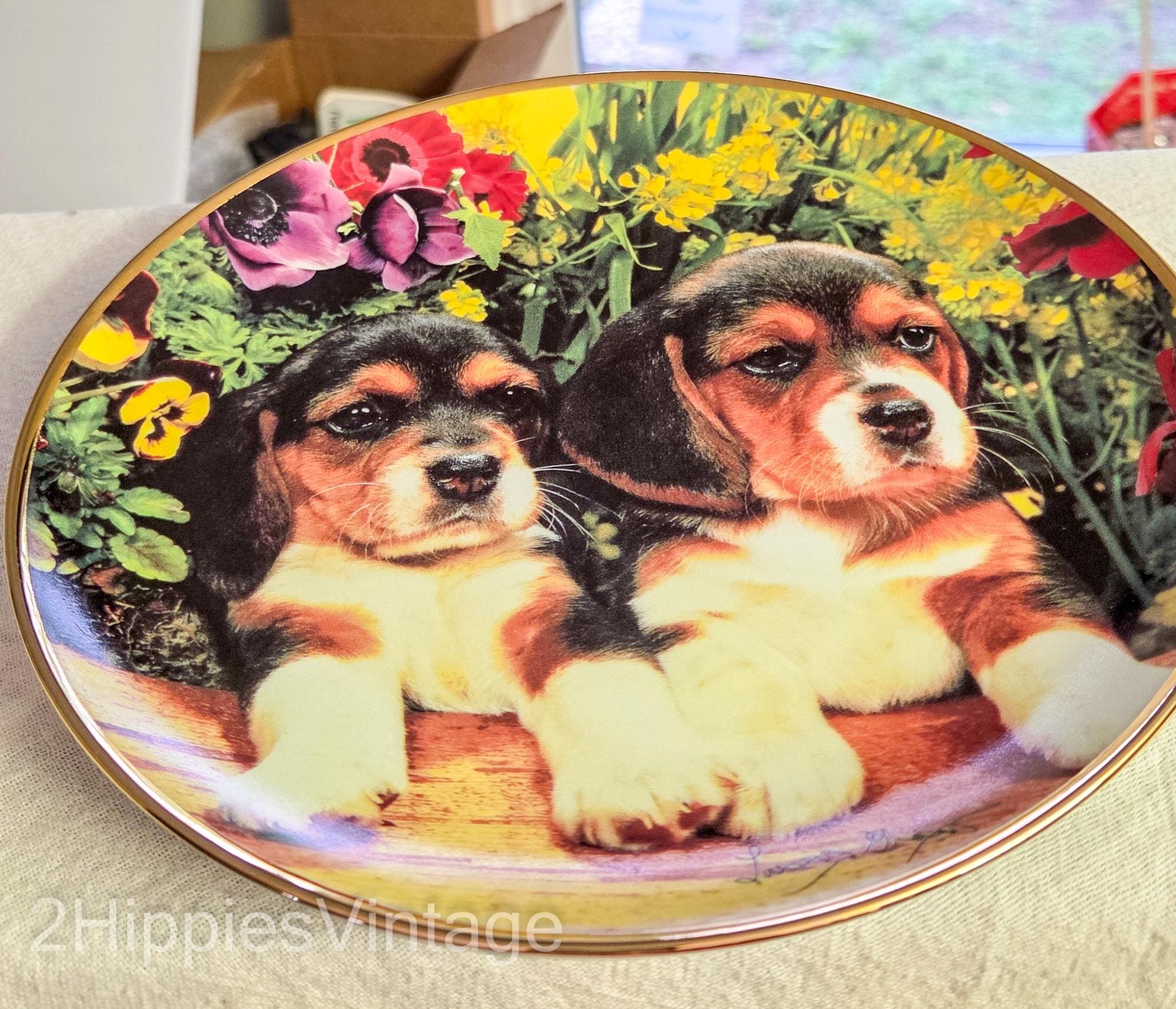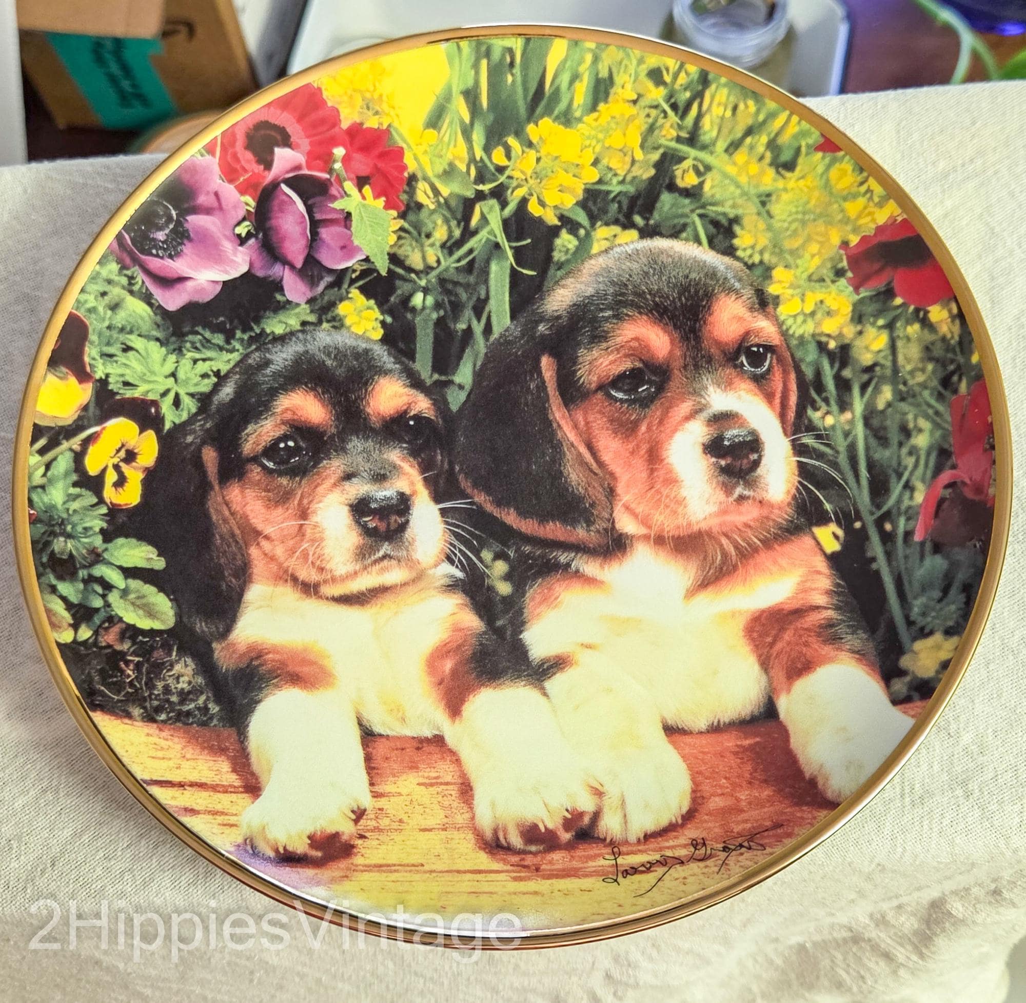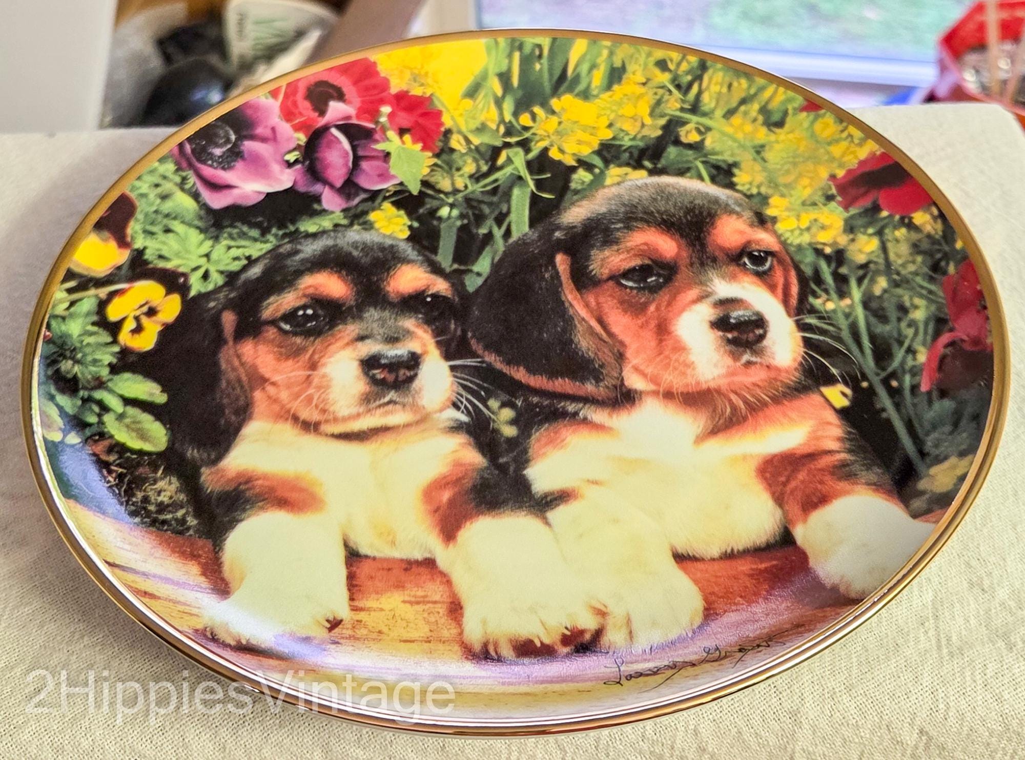 Design: Features two beagle puppies sitting among colorful flowers with a gold rim border.